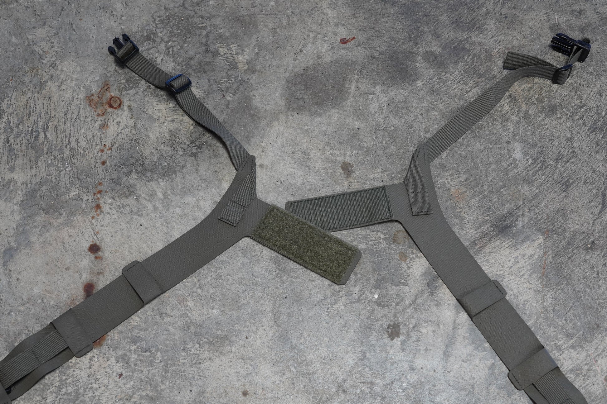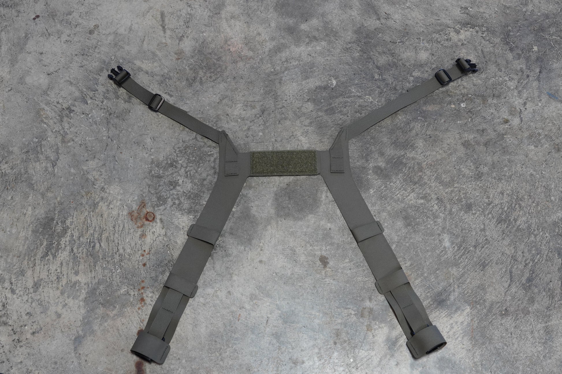 The Harness features adjustable width across the shoulders to fit different body types and clothing. It also has an adjustable circumference to attach to the sides of a chest rig.