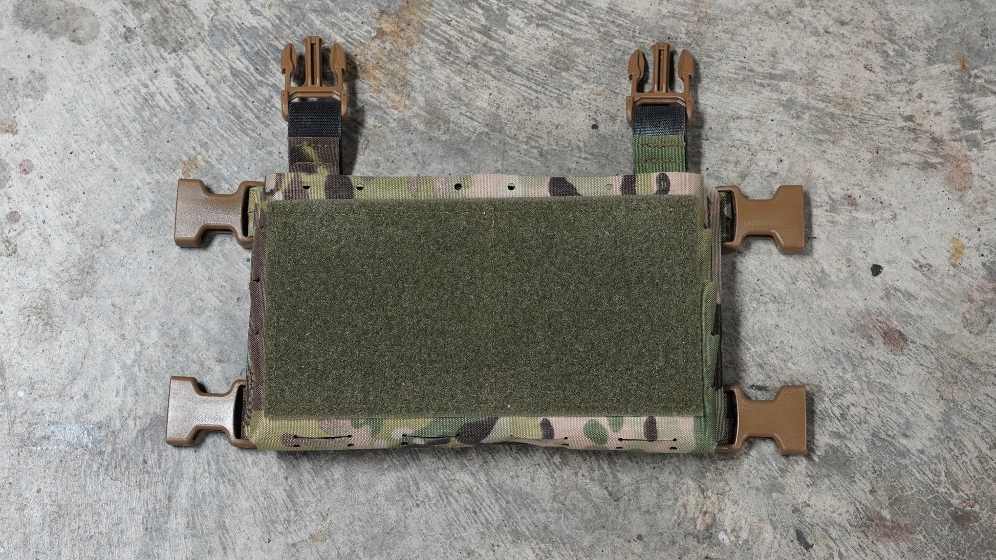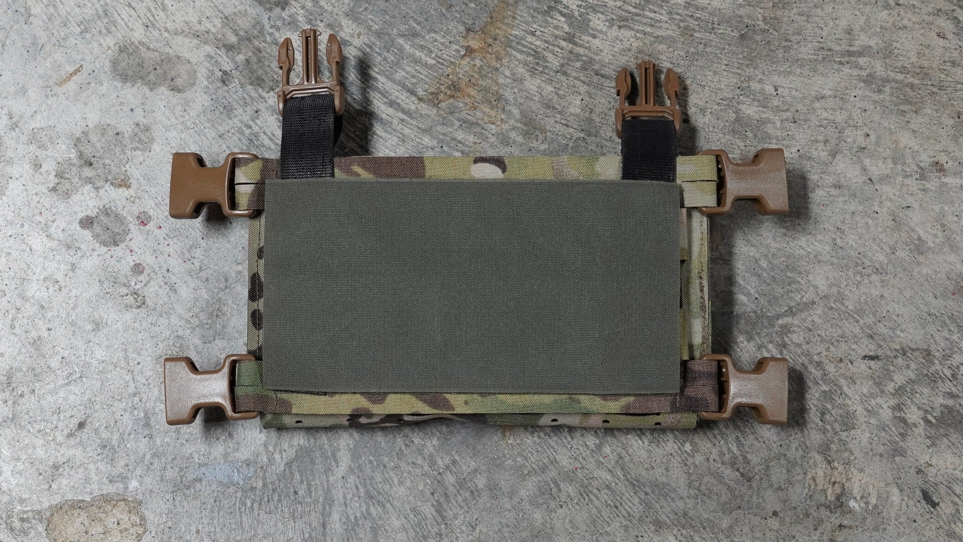 The vertical straps of the Placard 1 are made using ONE-WRAP®. This allows the user to adjust the ride height whether it is being used as a chest rig or as a placard on a plate carrier. The horizontal buckle mounting location is inset from the outer edges. This allows the material to hide away behind the placard if buckles are not being used. The Placard 1 will accept any magazine retention or other pouches and accessories that are hook-backed. The entire inside is lined with loop. The front of the placard has a loop field for patches or other accessories, and the back is hooked-lined to attach to a plate carrier. The Placard 1 has 3 pairs of holes at the top. On each side of the Placard 1 there are 4 rows of molle and 2 pair of holes at the top and bottom. On the bottom of the Placard 1 there are 4 pair of holes, and 2 sets of molle. Each hole is sized so that the user can add bungee or 550 cord to tie down extra equipment like TQ's. The molle slits can be used for attaching other pouches wire management or tie down points.